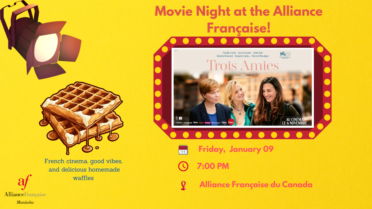 What is Movie & Waffles ? The projection of a French-speaking movie with English subtitles, accompanied by delicious waffles! It's free and we provide waffles !