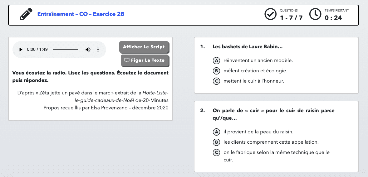 The DELF B1 or DELF B2 are composed of three collective sections (oral comprehension, written comprehension, and written expression) and one individual one (oral expression). To help you prepare properly for the exam, you will have access to training exercises for all the different sections on our platform!