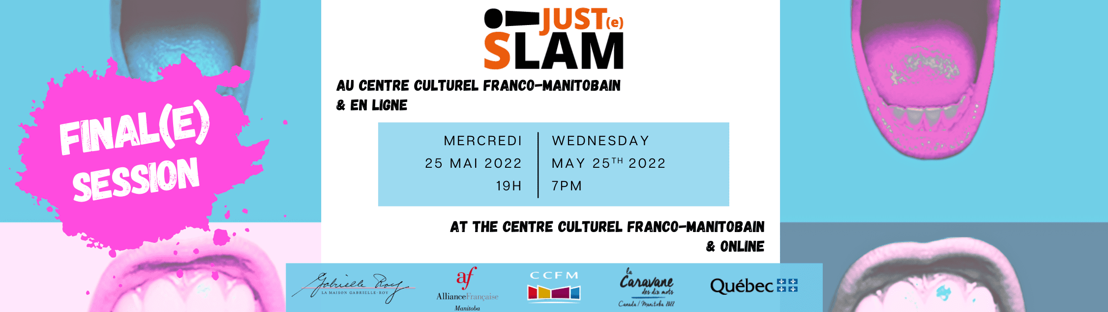 Just(e) Slam est une série de soirées dédiées au slam, aux déclamations, aux performances, aux chuchotements, à l’émotion, aux rires et à la poésie orale et vivante, offrant une scène et un micro ouverts à tous: francophones, anglophones, franglophones…!