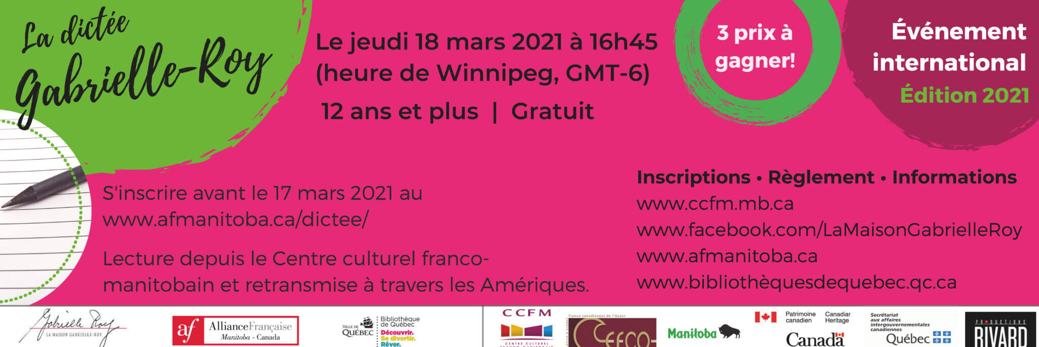 La 4ème édition de la Dictée Gabrielle-Roy / le 18 mars 2021 à 17h (HAC) / en